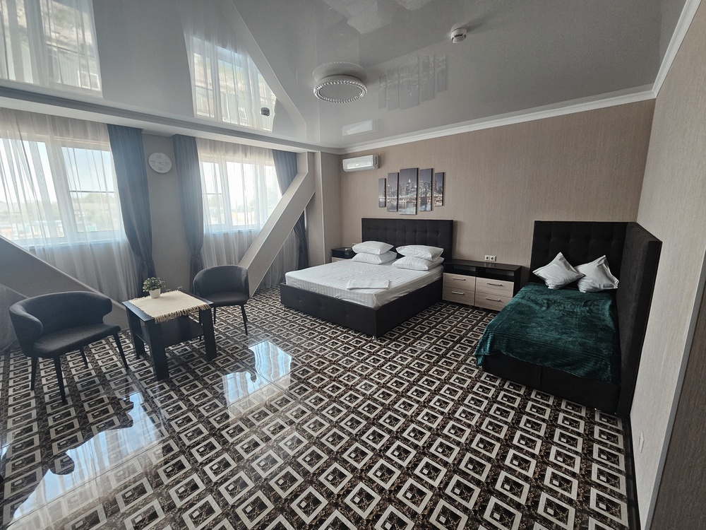Теплая цветовая гамма, неподражаемый интерьер и дизайнерская мебель из дерева создают особенную атмосферу этого номера. Номер с кухней и рабочей зоной, а также просторная спальня с большой кроватью — мы создали все условия, чтобы вы могли плодотворно работать и полноценно отдыхать.