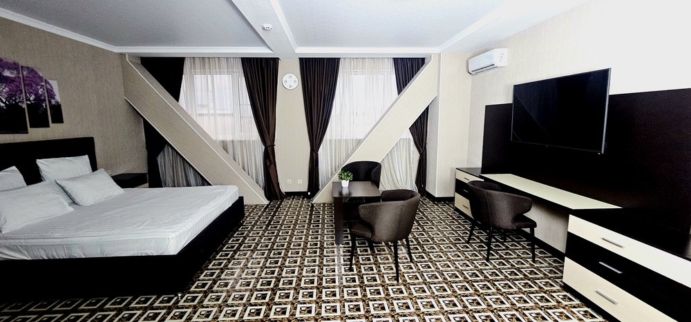 Теплая цветовая гамма, неподражаемый интерьер и дизайнерская мебель из дерева создают особенную атмосферу этого номера. Номер с кухней и рабочей зоной, а также просторная спальня с большой кроватью — мы создали все условия, чтобы вы могли плодотворно работать и полноценно отдыхать.